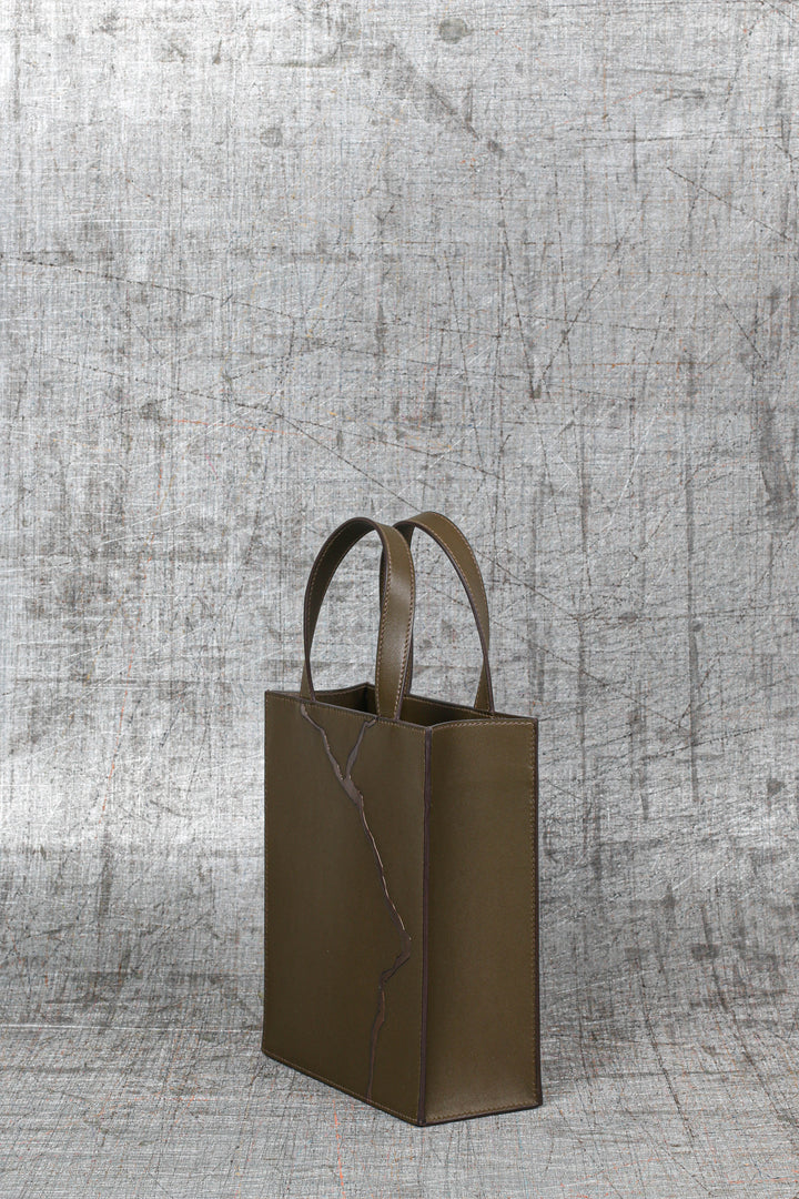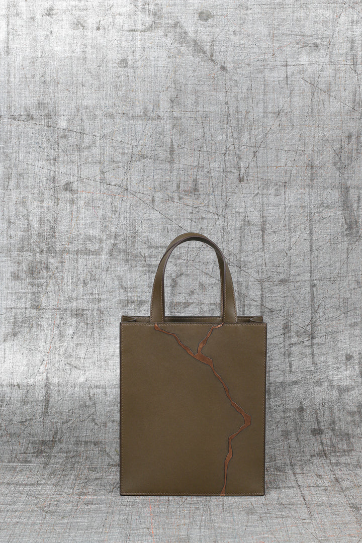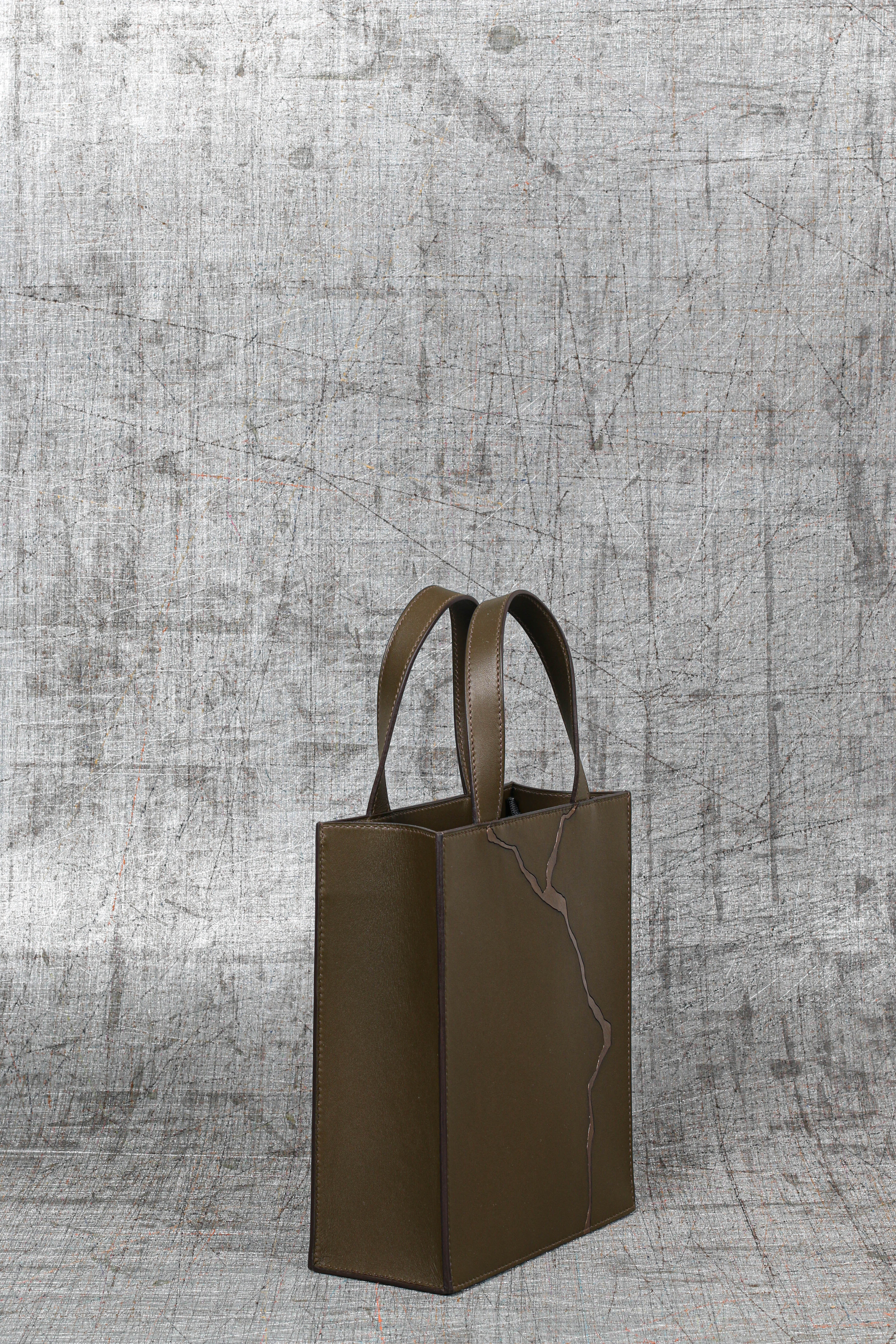 The Kintsugi bag combines a gold join and expertise in leather marquetry. Each bag is unique because each "crack", drawn freehand, is one-of-a-kind.
