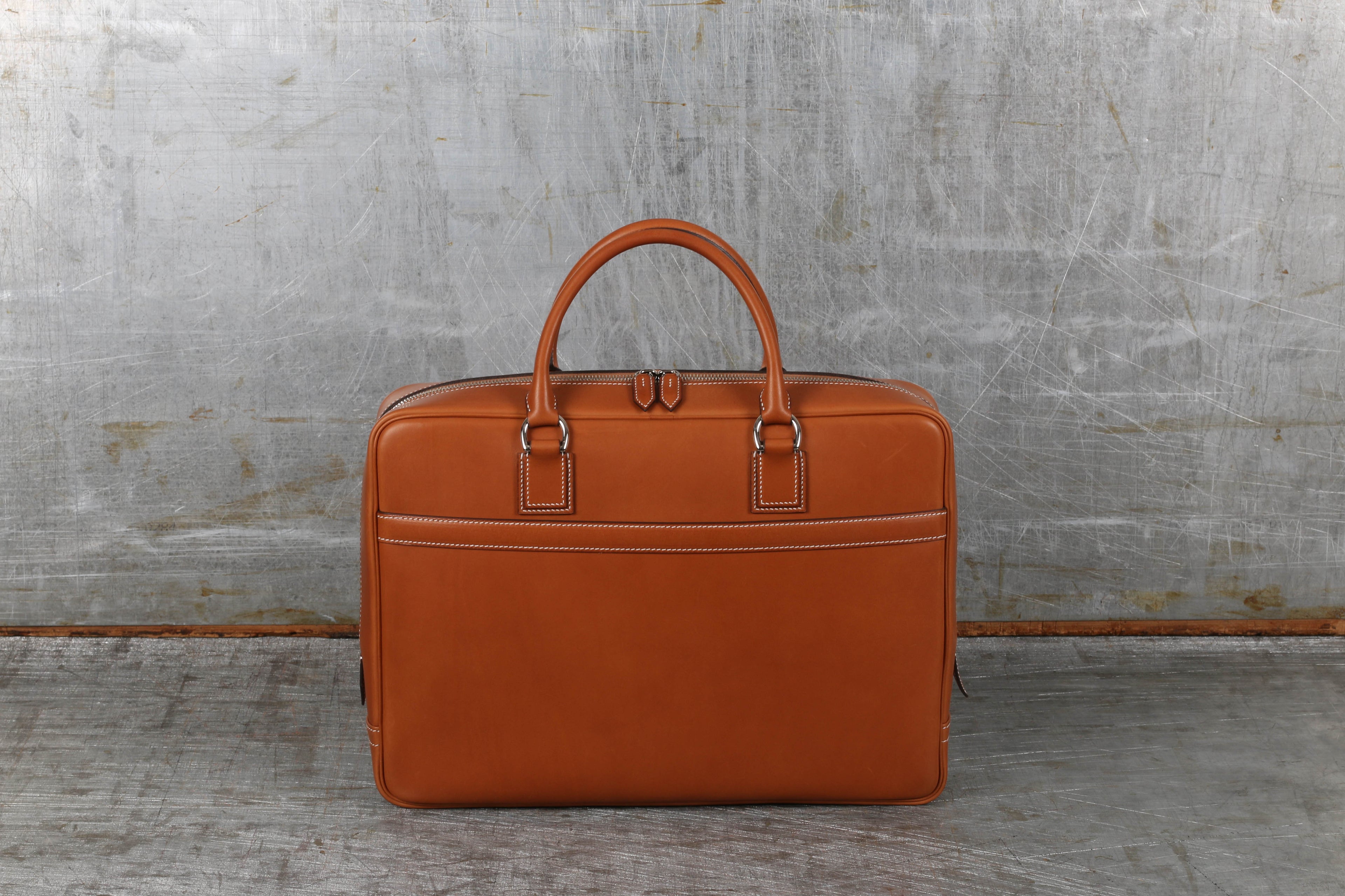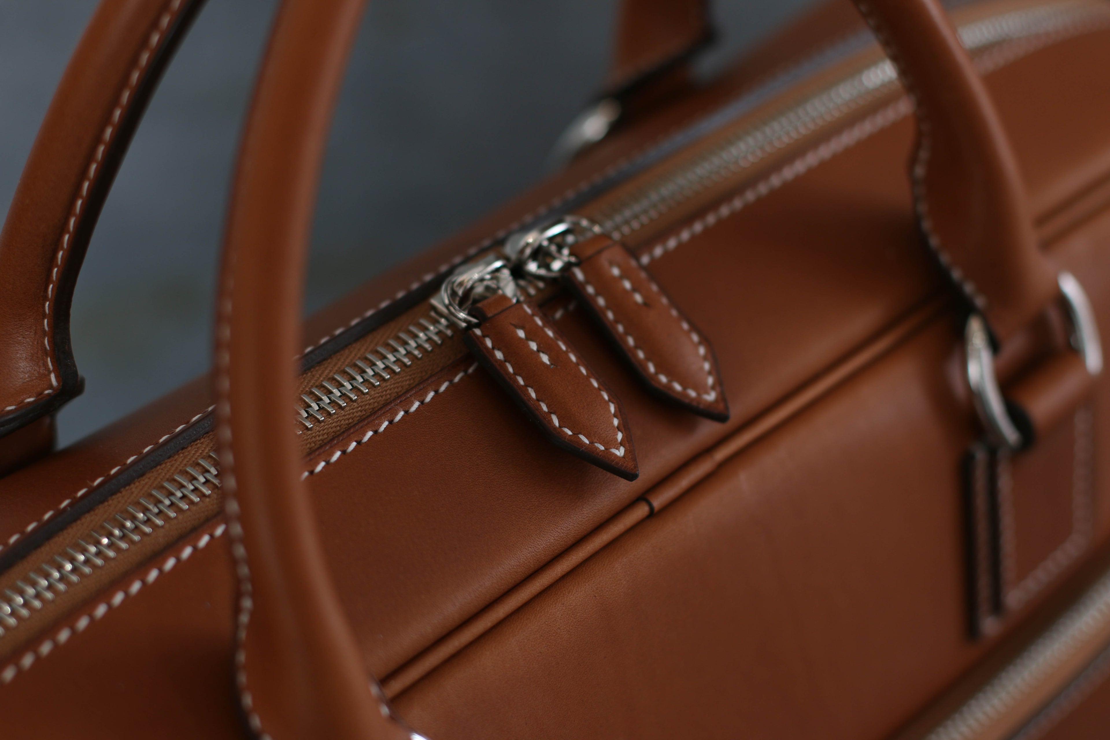 L'intérieur, en veau, comprend une poche zippée et une poche plate.