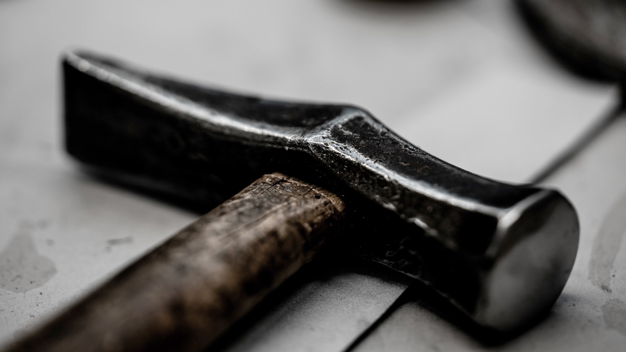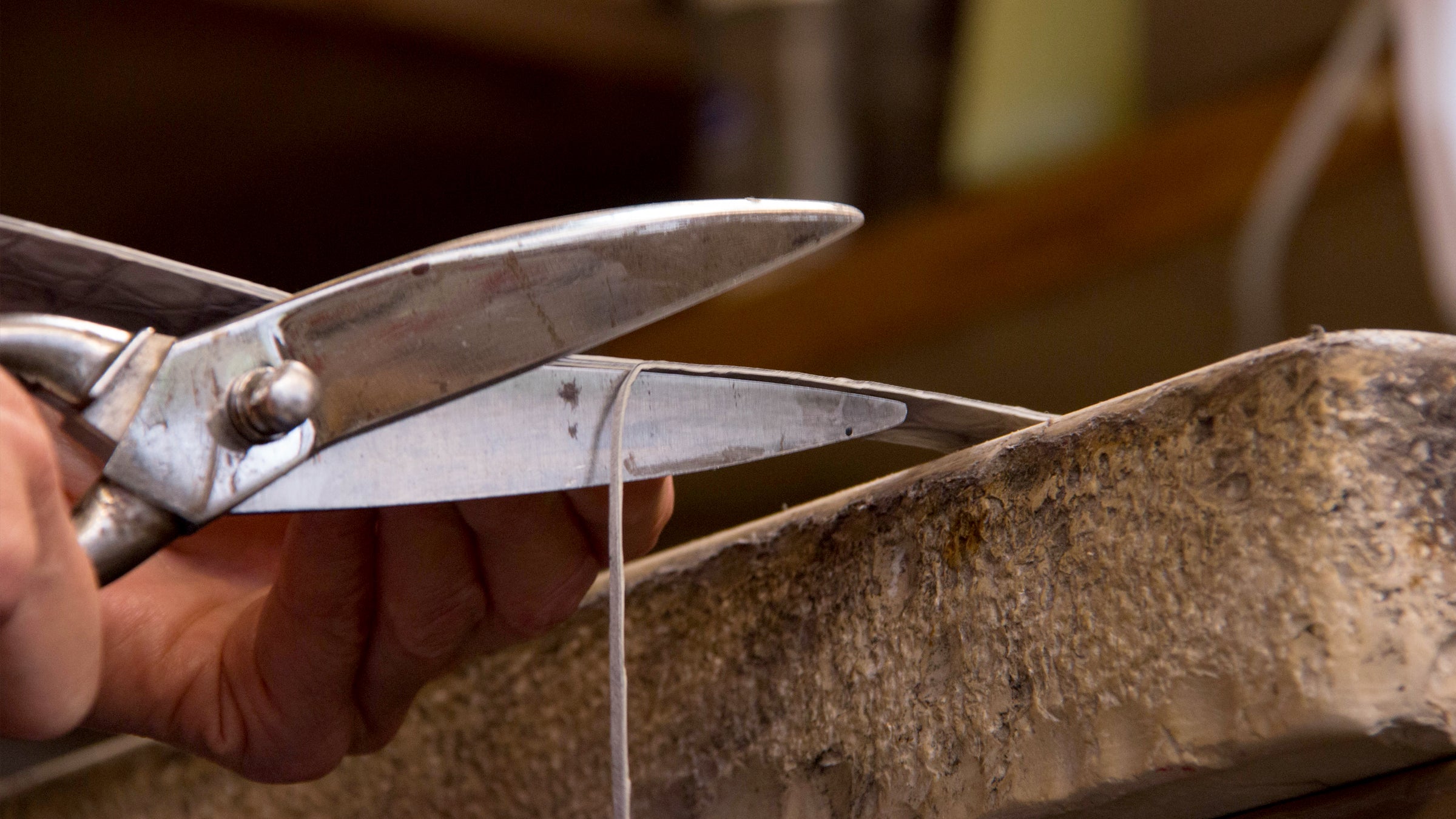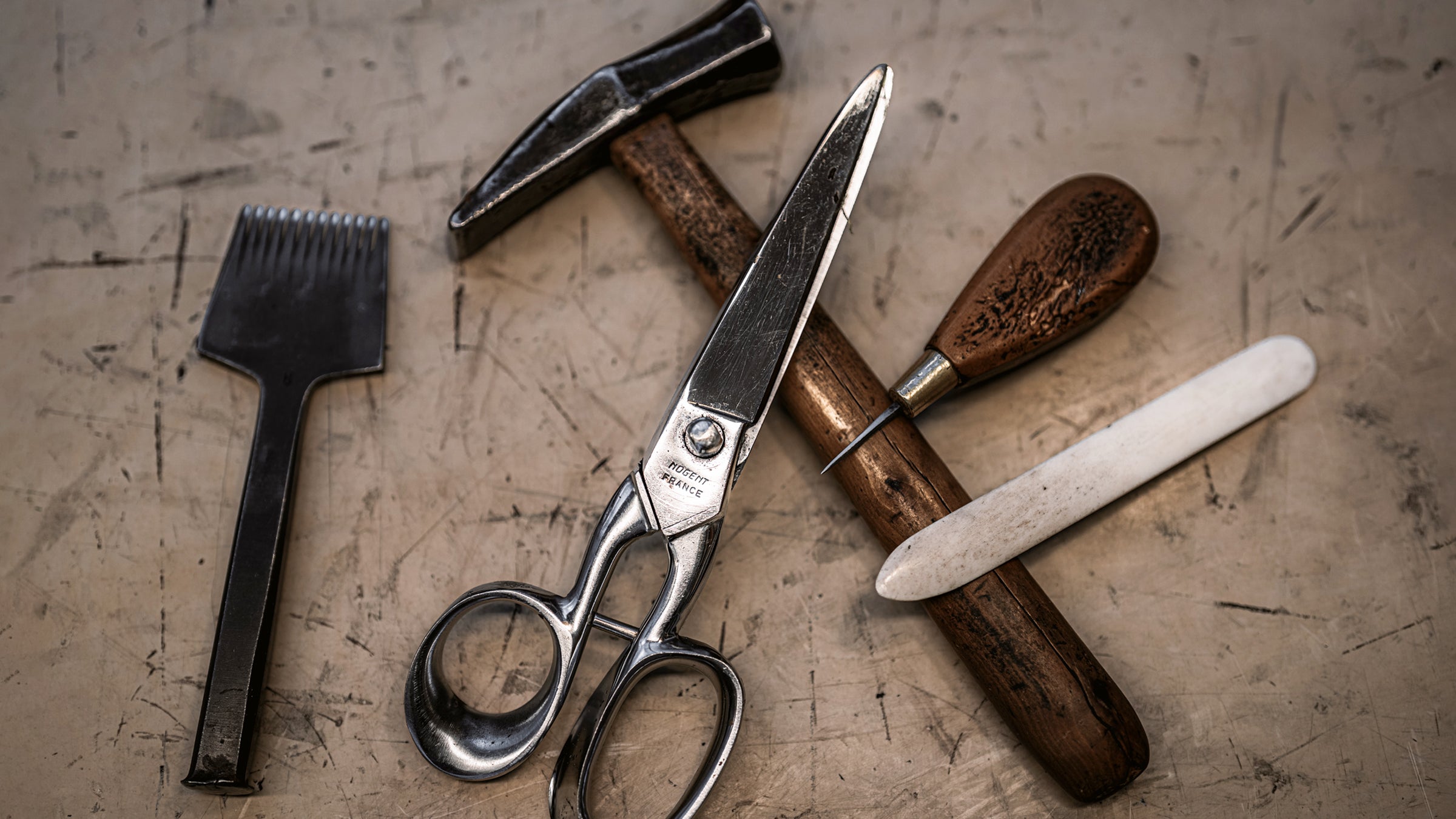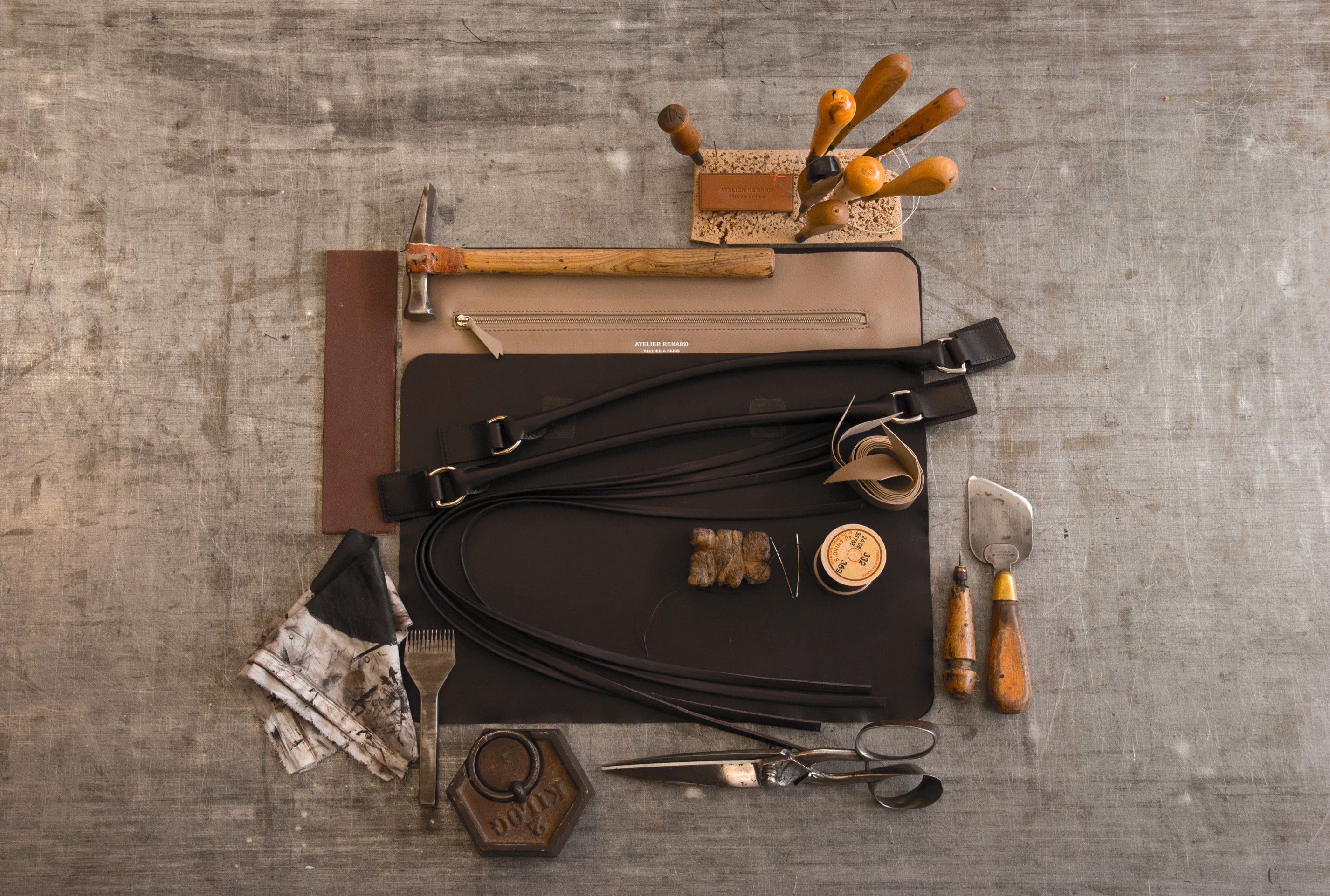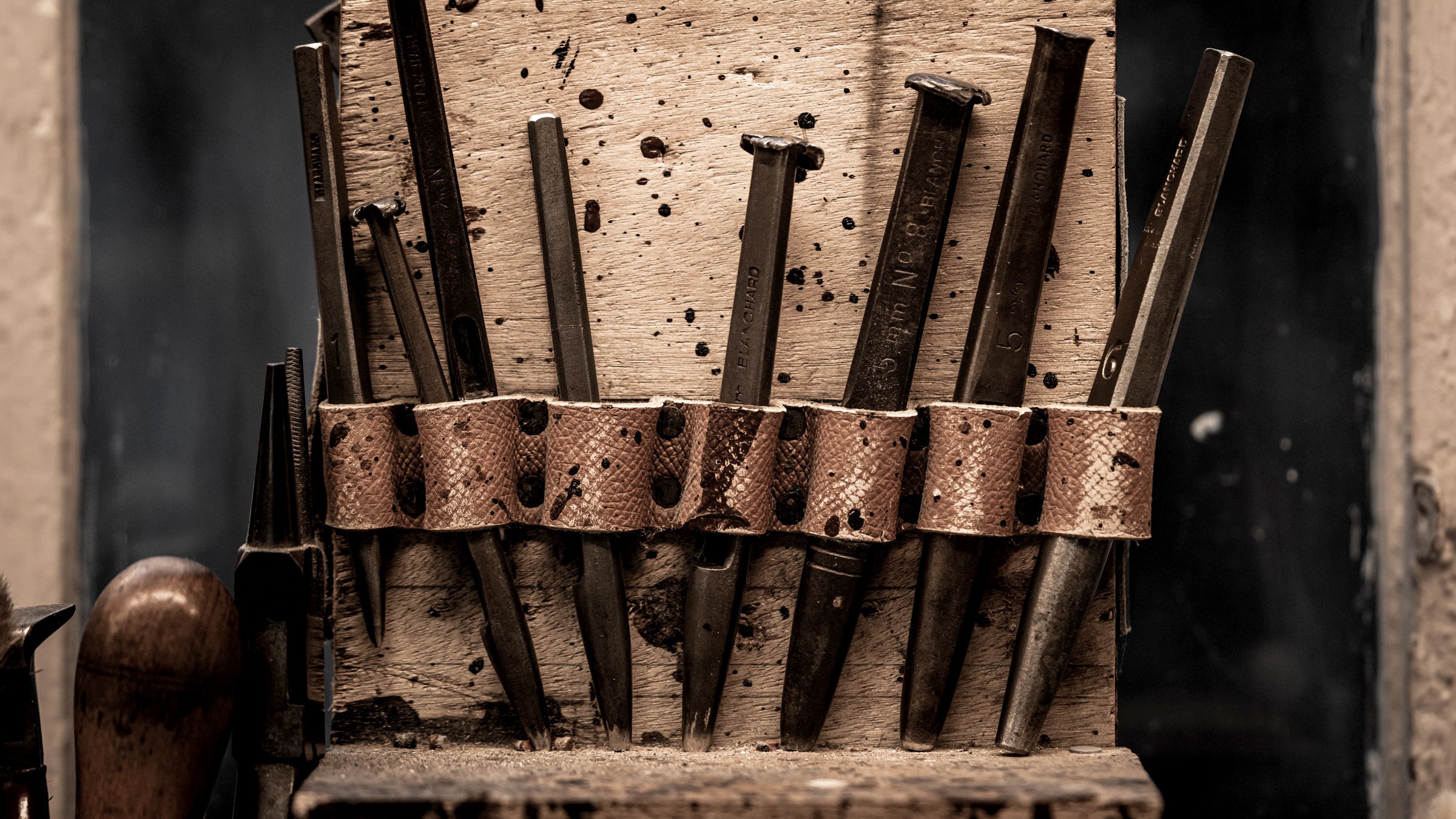L’abat-carre pour araser les bords d’un cuir, l’alène et les aiguilles indispensables à la couture main, le nerf de la guerre du sellier, la bouterolle pour arrondir en douceur la tête d’un rivet, les ciseaux à froid pour les fentes dans le cuir, les ciseaux coupants et forts, le compas, la cornette, le couteau à parer, à pied ou demi-lune, les emporte-pièces, les fers à fileter, la griffe à frapper avec ses dents pour percer le cuir et préparer à la couture, la lissette en bois, le maillet, la pierre à parer sur laquelle raisonne le marteau, la pige pour mesurer l’épaisseur du cuir, la cire pour les finitions, et bien sûr la pince à coudre.