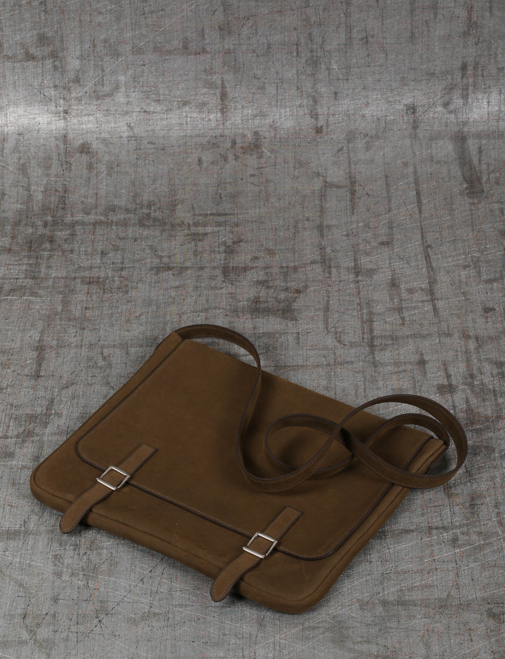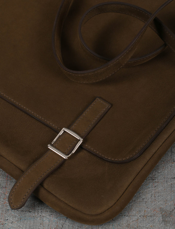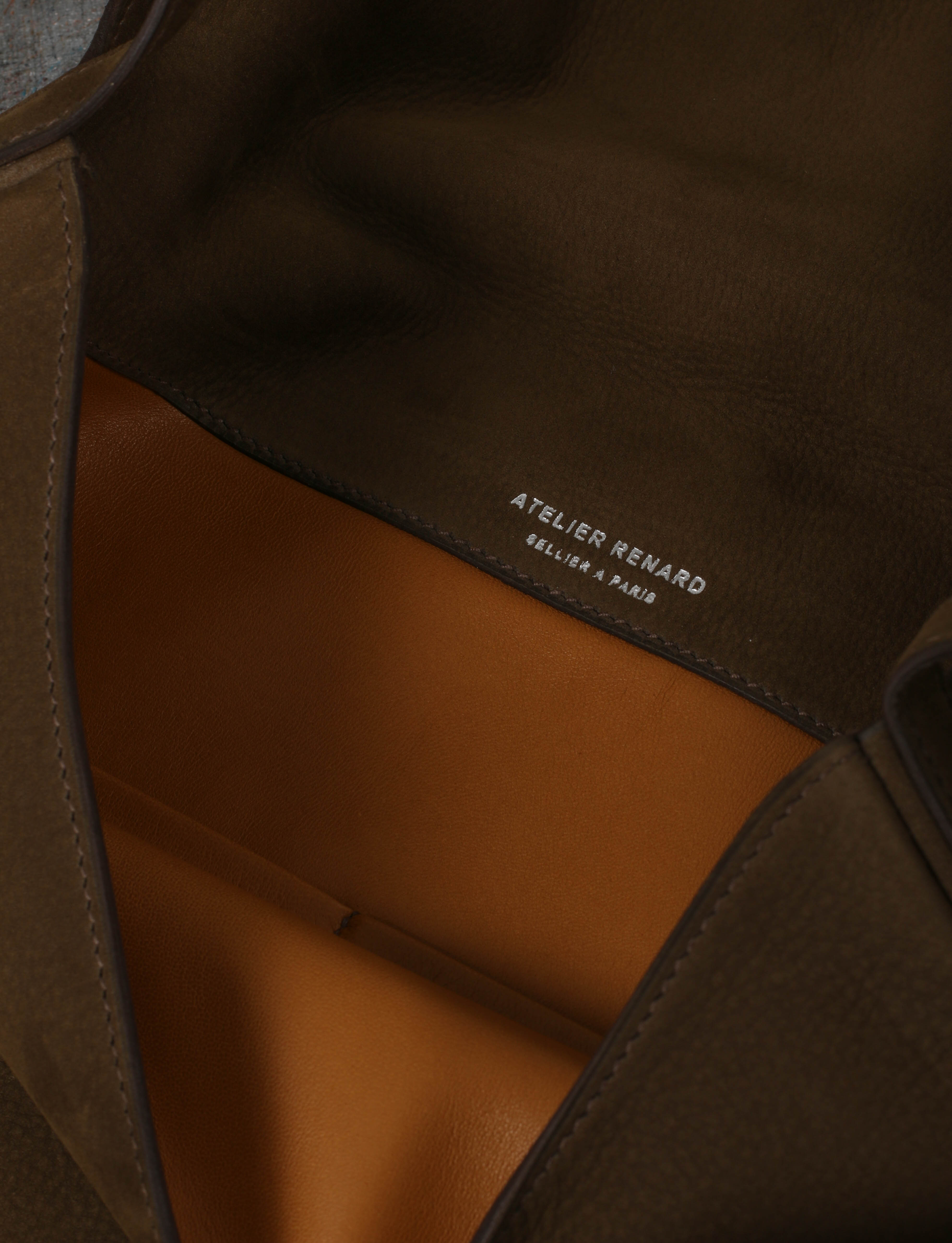 Taurillon nubuck écusson, intérieur en agneau café au lait, couture ton sur ton