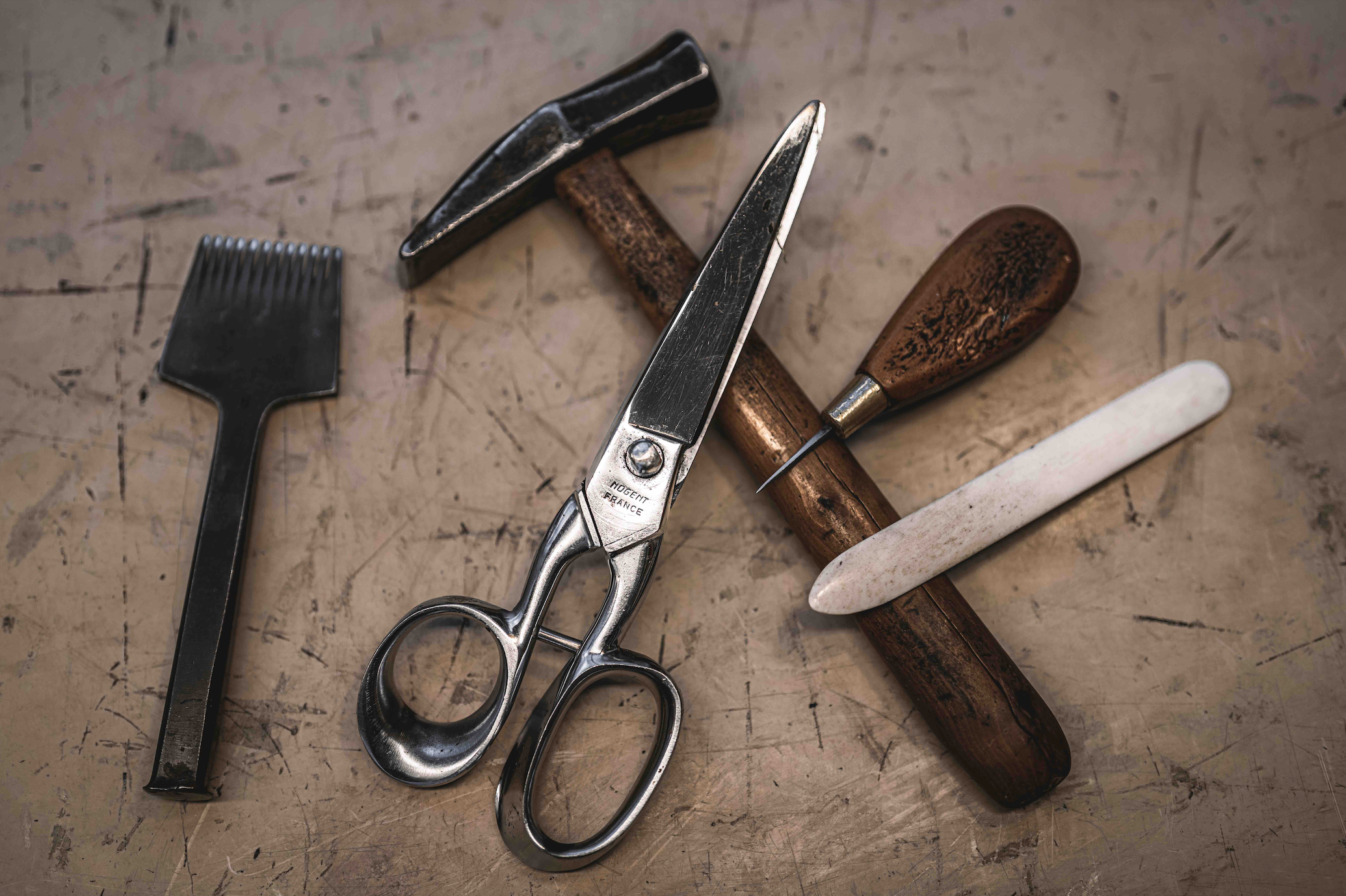 De gauche à droite : la griffe à frapper, qui sert à marquer les points de couture, les ciseaux, le marteau, l’alêne losangique, qui sert à percer le cuir pour la couture main caractéristique du savoir-faire sellier, et la lissette, qui sert à mouler le cuir.