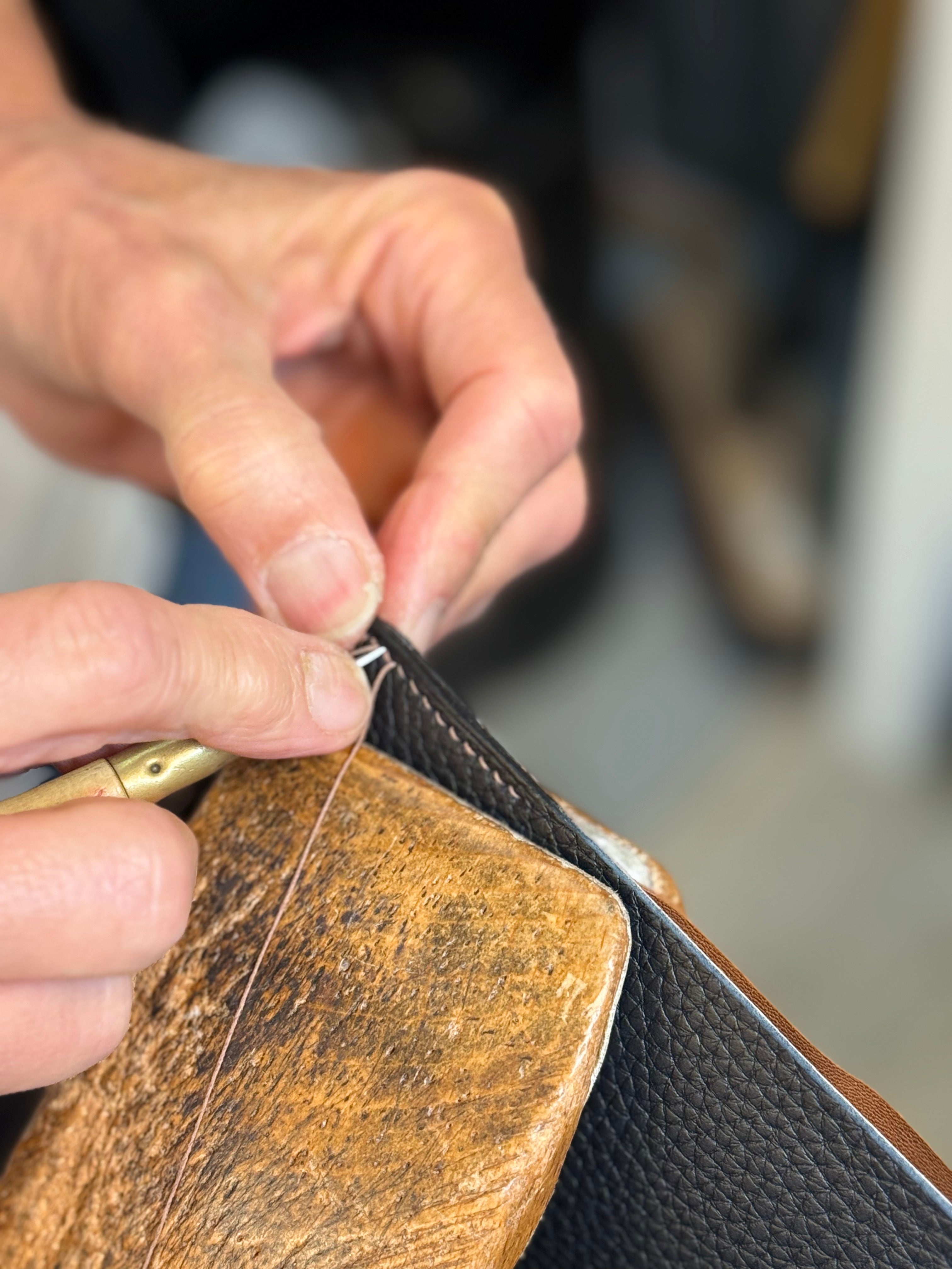 L’objet est maintenu dans une pince à coudre en bois, et la couture est réalisée avec 2 aiguilles et un seul fil. Chaque point est placé. De ce fait la couture est aussi belle dessus et dessous.